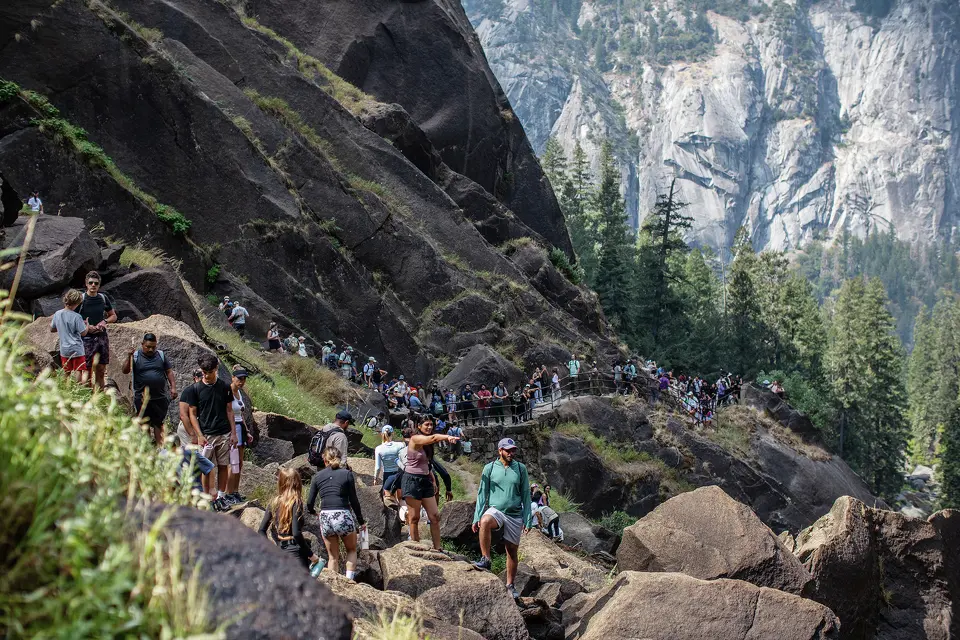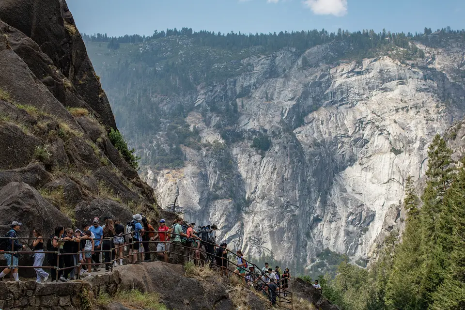 Los visitantes recorren el sendero Mist Trail hacia la cascada Vernal Falls el 31 de agosto de 2025, en el Parque Nacional de Yosemite. Apu Gomes/Getty Images