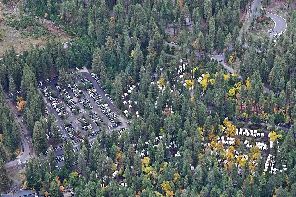Se observan las tiendas de lona blanca de Curry Village y un estacionamiento abarrotado desde Glacier Point en el Parque Nacional de Yosemite el 25 de octubre de 2025, en medio del cierre actual del gobierno de los EE. UU. Frederic J. Brown/AFP/Getty Images