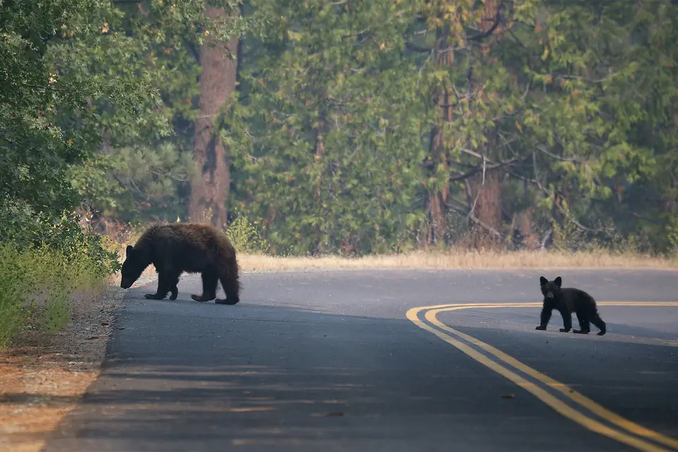 Una osa y un cachorro cruzan una carretera cerca del Incendio Rim el 24 de agosto de 2013, en el Parque Nacional de Yosemite. Justin Sullivan/Getty Images